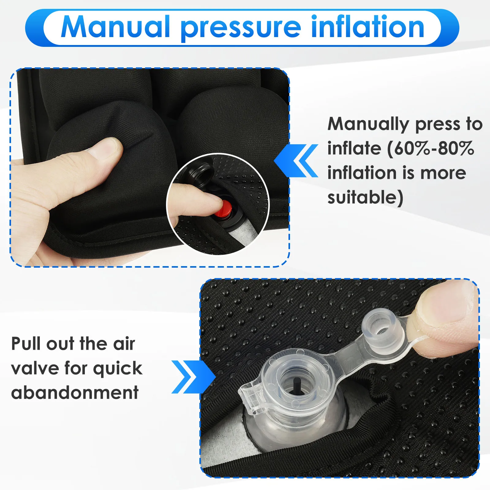 Le réglage de la pression d’air est pratique et le produit est esthétiquement réussi. Je l’ai essayé dans la voiture et il est plus petit que le siège ; il m’ajuste trop avec peu de marge. J’aurais aimé que ce soit un peu plus grand. Il possède de bonnes propriétés antidérapantes pour ne pas glisser sur le siège.