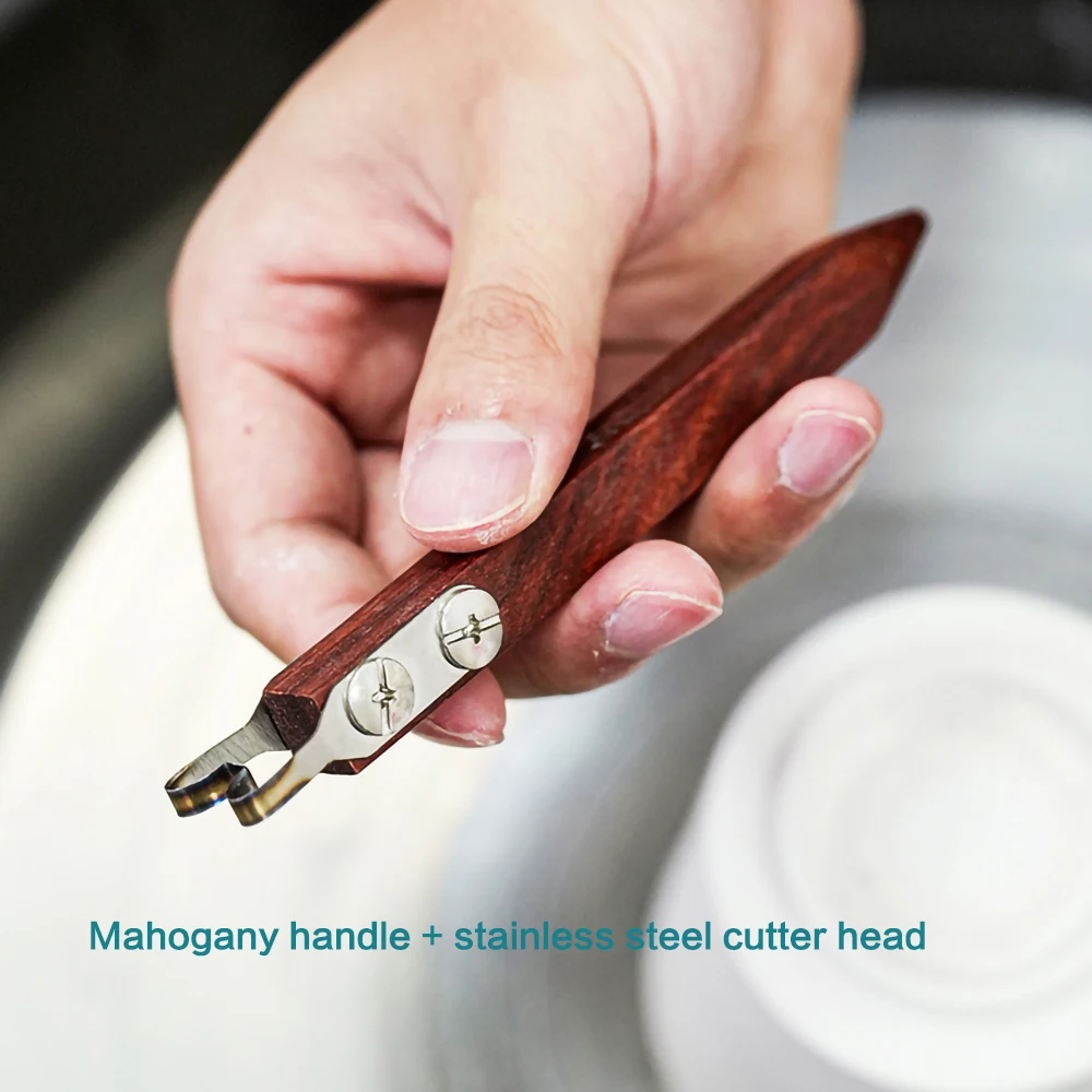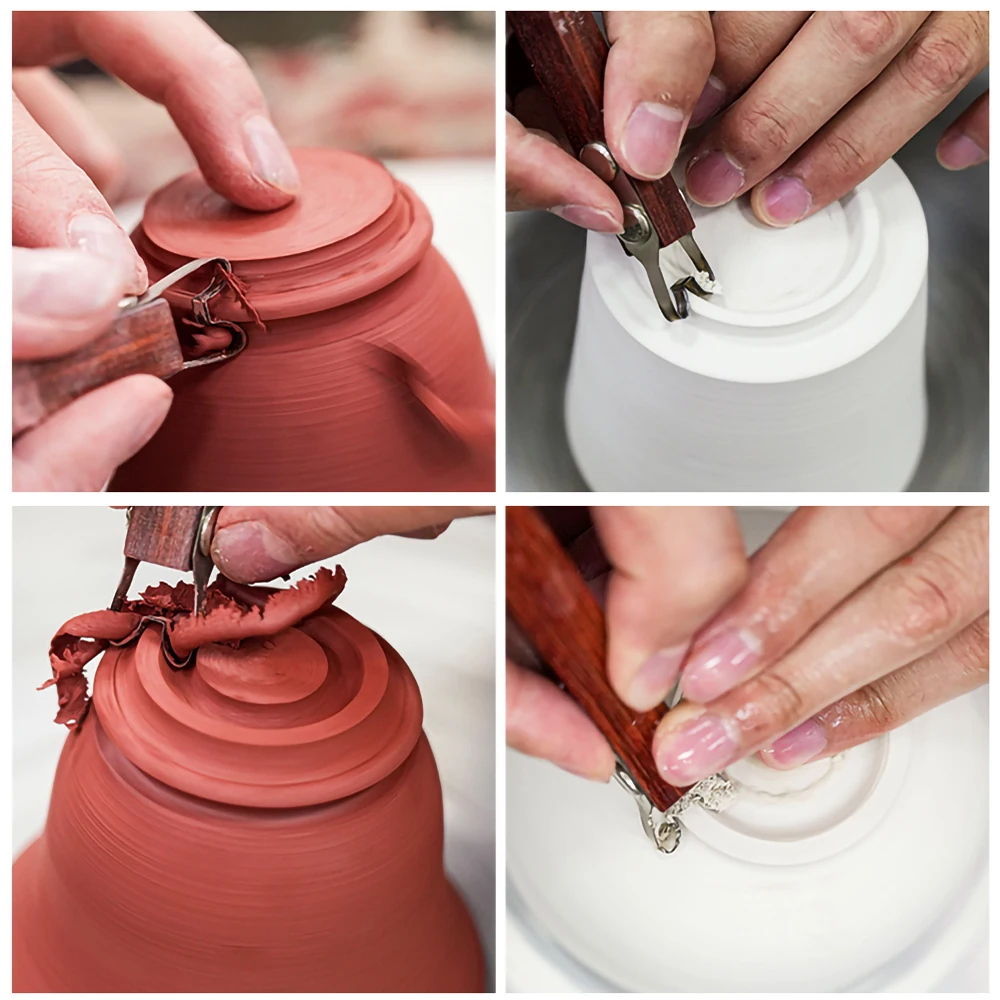 Outils de poterie. Outil de coupe d’argile avec manche en bois, anneau de modélisation en céramique, grattoir de pied, pot de fleur, outil de coupe de plaque