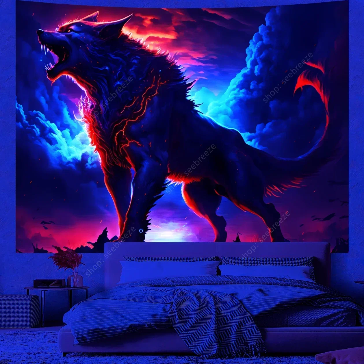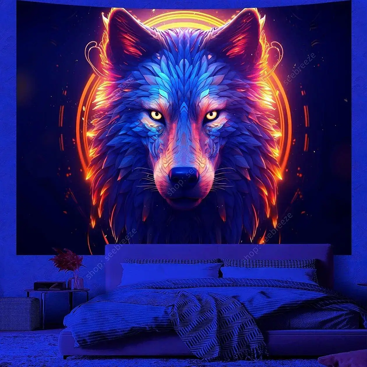 Tapisserie animale loup psychédélique, tapisserie réactive UV, tenture murale, décor de chambre Hippie, couverture de canapé, serviette de plage, cadeau pour ami