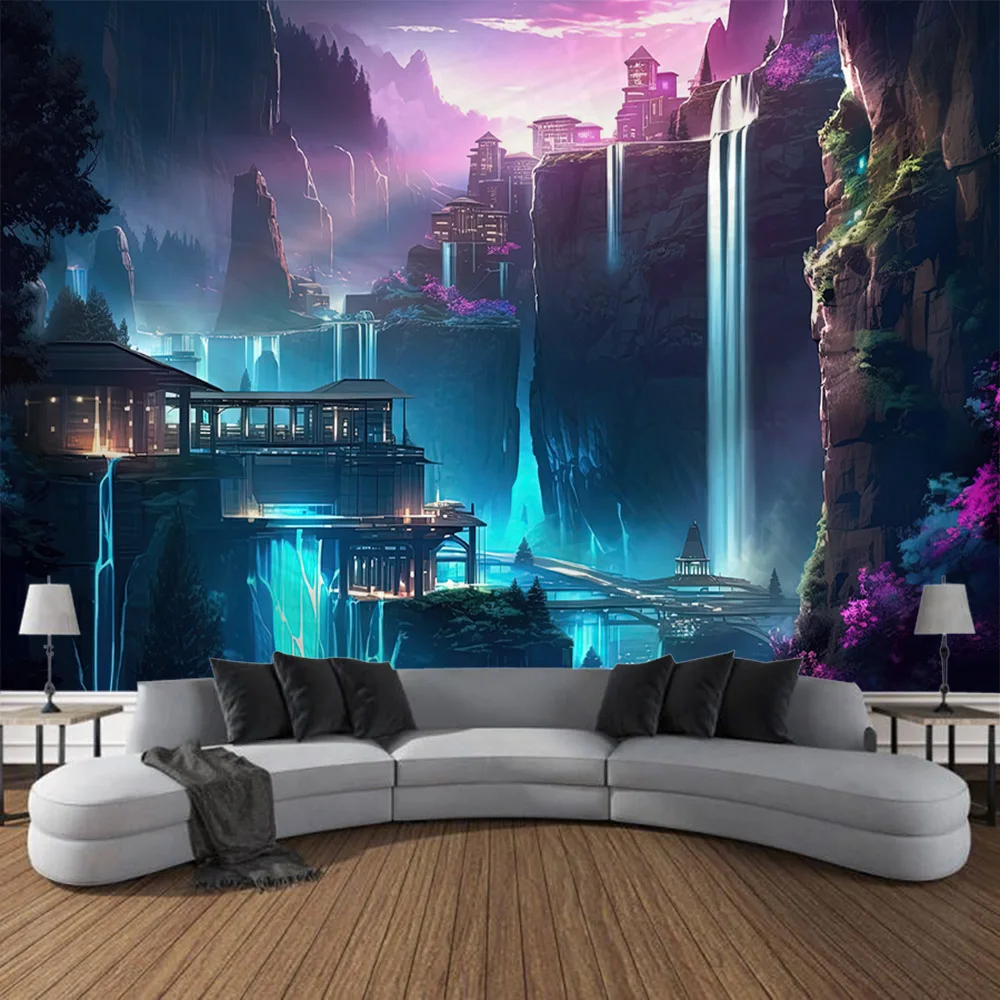 Tapisserie murale suspendue en cascade de rêve colorée, nuit de forêt, paysage de ciel étoilé, décoration de maison, dortoir, salon, chambre à coucher