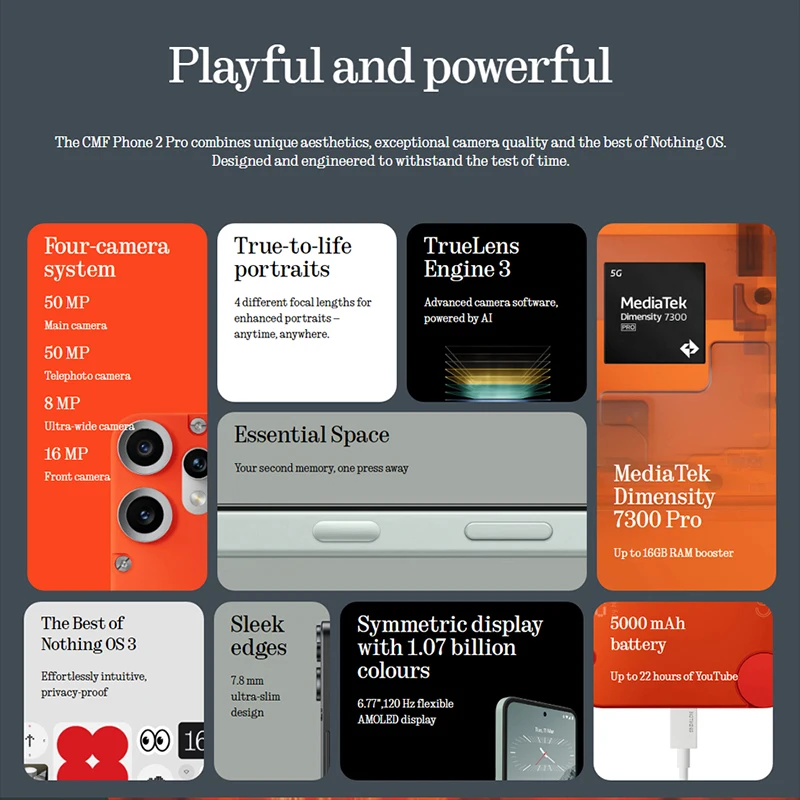 Téléphone CMF 2 Pro Version mondiale 6.77 AMOLED 120Hz MediaTek Dimensity 7300 Pro 5G 5000 mAh caméra principale 50MP 33W
