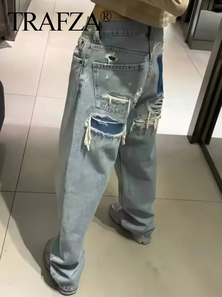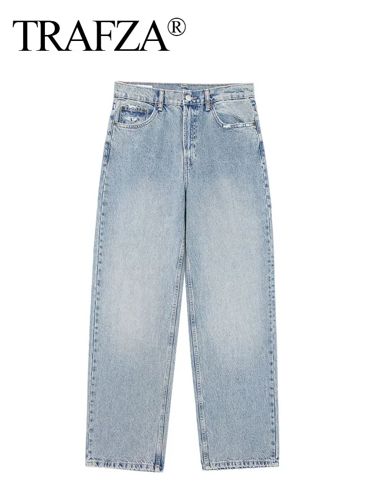 TRAFZA jean pour femmes 2024 Denim solide ample fermeture éclair mouche femme trou pantalon poches sauvage basique trajet femme jambe large pantalon Long